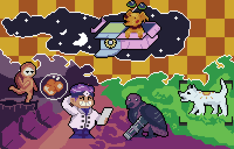 All the things are there, but you would probably be a bit more into it if the game looked nice. I turned to lospec.com, a great resource for things about pixel art, and decided to go with the Nyx8 color palette to give my game a makeover. Limiting myself to a few colors to choose from does not guarantee that the game will look nice, but reduces the number of artistic crimes I am able to commit. This is the game after I redrew everything: